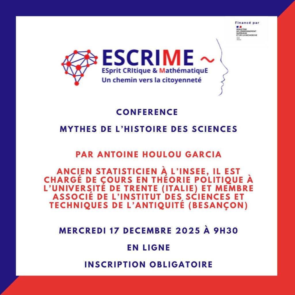 Nous sommes très heureux de vous partager le projet ESCRIME porté par l’association Les Maths En Scène et financé par le Ministère de l’Enseignement supérieur, de la Recherche et de l’Espace. Ce projet explore comment les mathématiques peuvent devenir un véritable levier de développement de l’esprit critique.