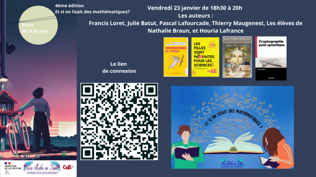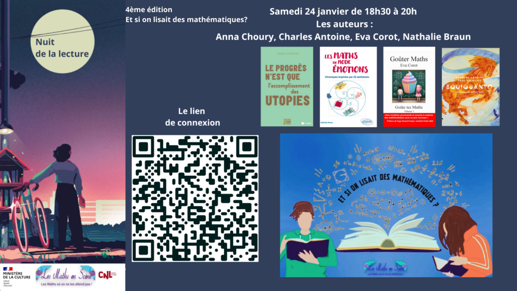 Dans le cadre des Nuits De La Lecture 2026, plus que jamais essentielles pour conquérir de nouveaux lecteurs et célébrer l’importance du livre et de la lecture, nous vous invitons à deux soirées dédiées au plaisir des mathématiques et de la lecture.