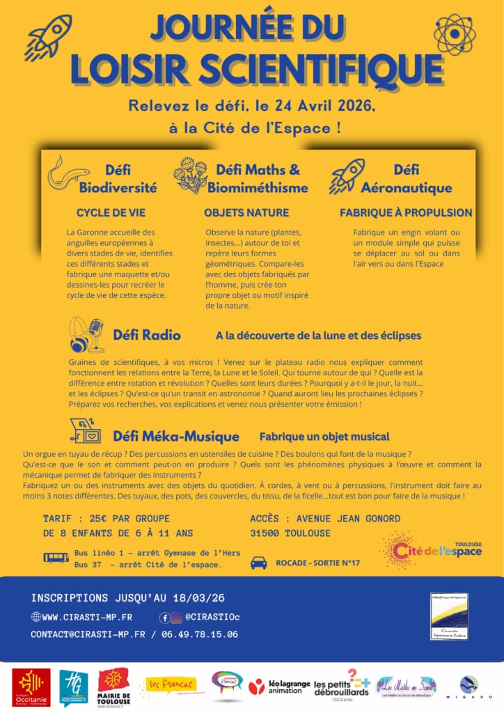 La Journée du Loisir Scientifique 2026 revient le vendredi 24 avril à la Cité de l’espace ! C’est l’occasion de choisir et relever un défi parmi les 5 et de découvrir la Cité de l’espace durant les vacances de Printemps.